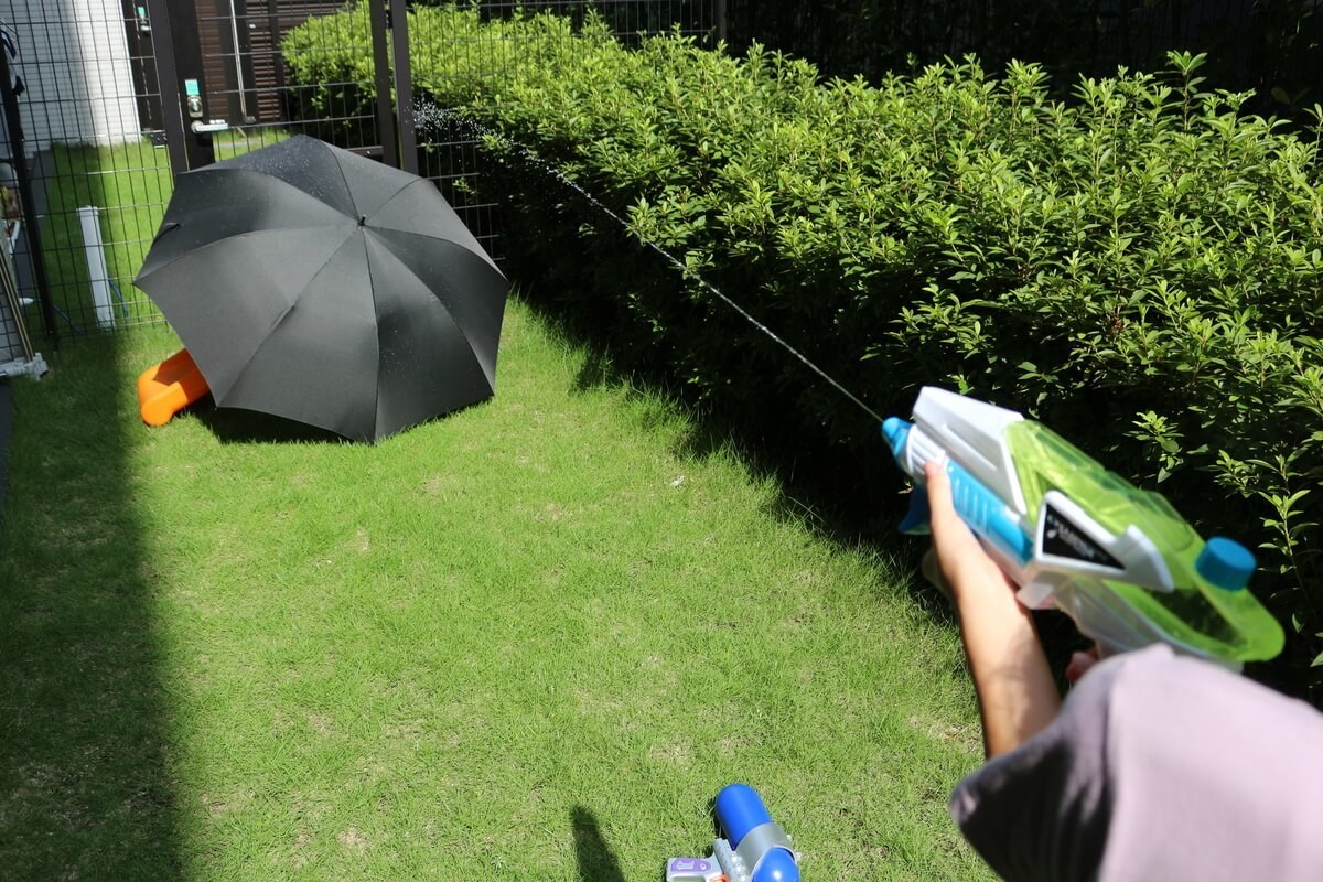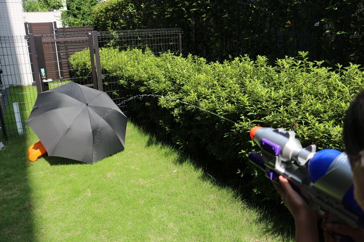 今の水鉄砲はタンクに水がいっぱい入るし、よく飛びますね。