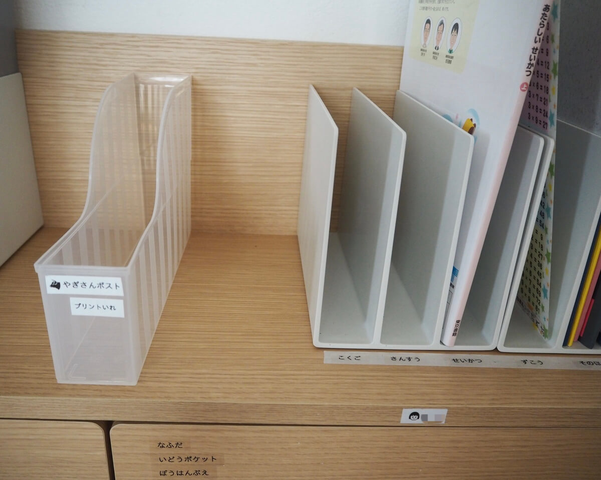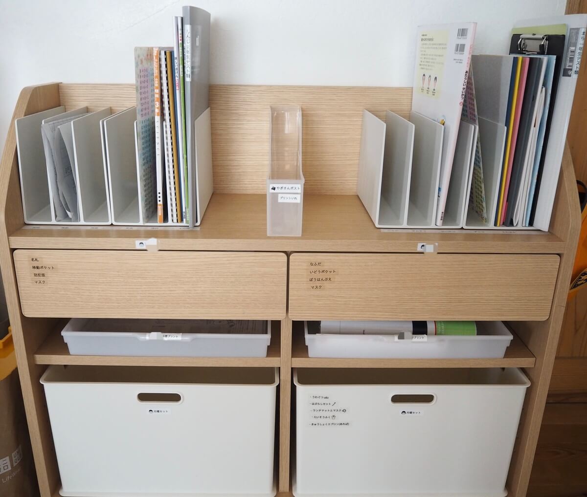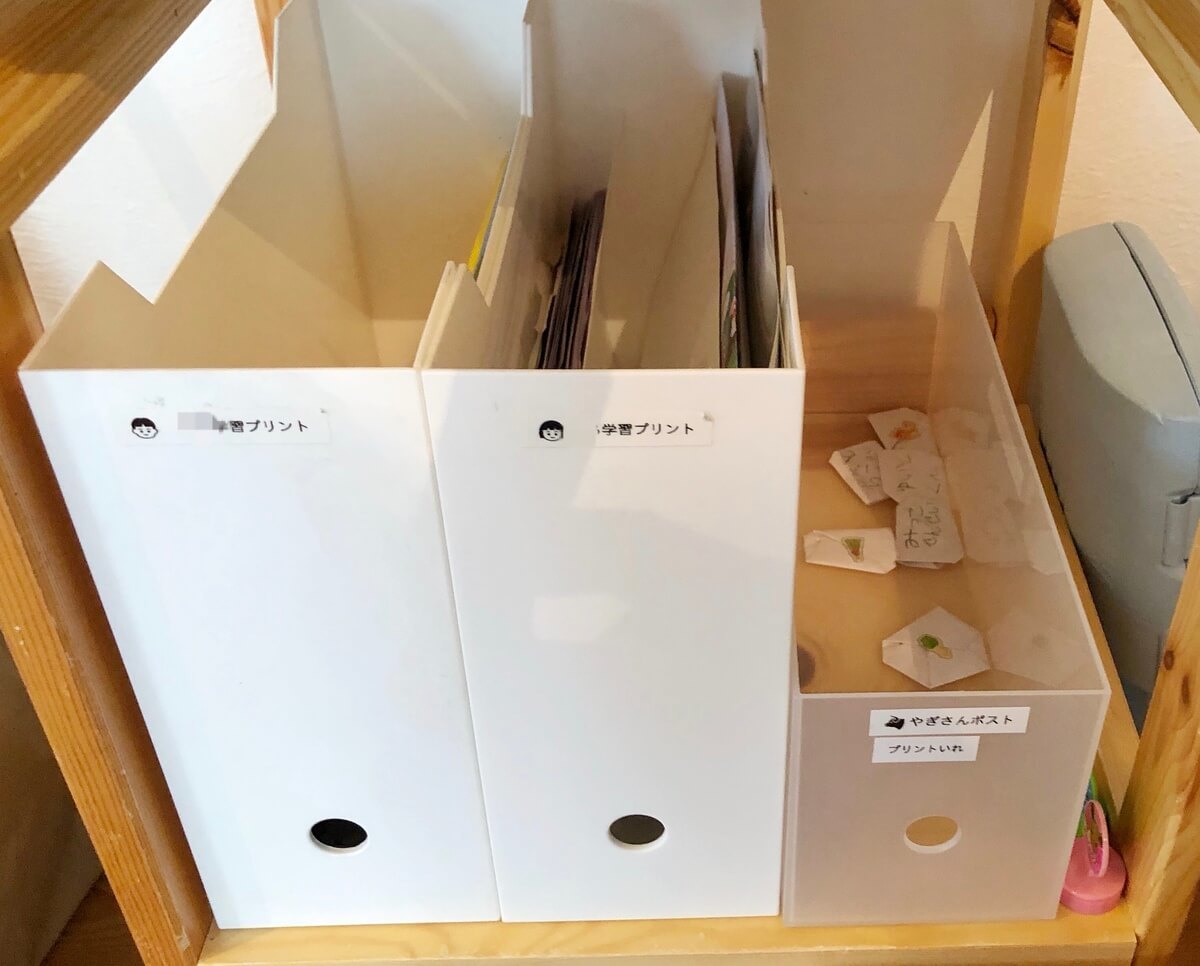 左側2つの白のファイルボックスはニトリのもので、子ども分用意してここに持ち帰ってきた学習プリントを収めていました。