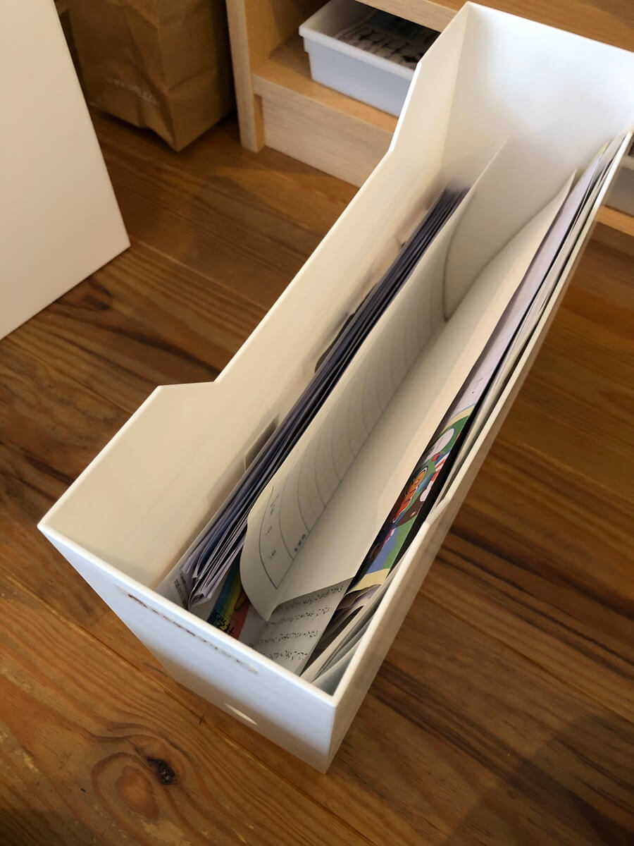 ニトリのファイルボックスにしても無印良品のボックスにしても、プリントを入れるだけなのに無駄に横幅があるので、中で気づけば折れ曲がっている事がしばしば。