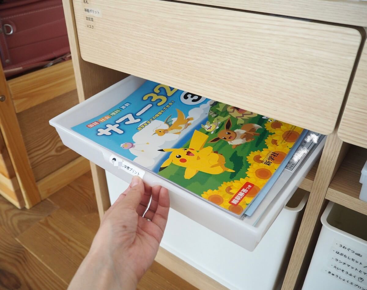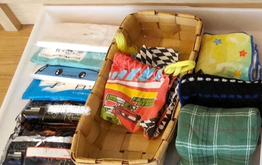 ティッシュやハンカチなどは、セットで移動ポケットに入れて登校するので、引き出しやトレーなどにまとめて収納していました。