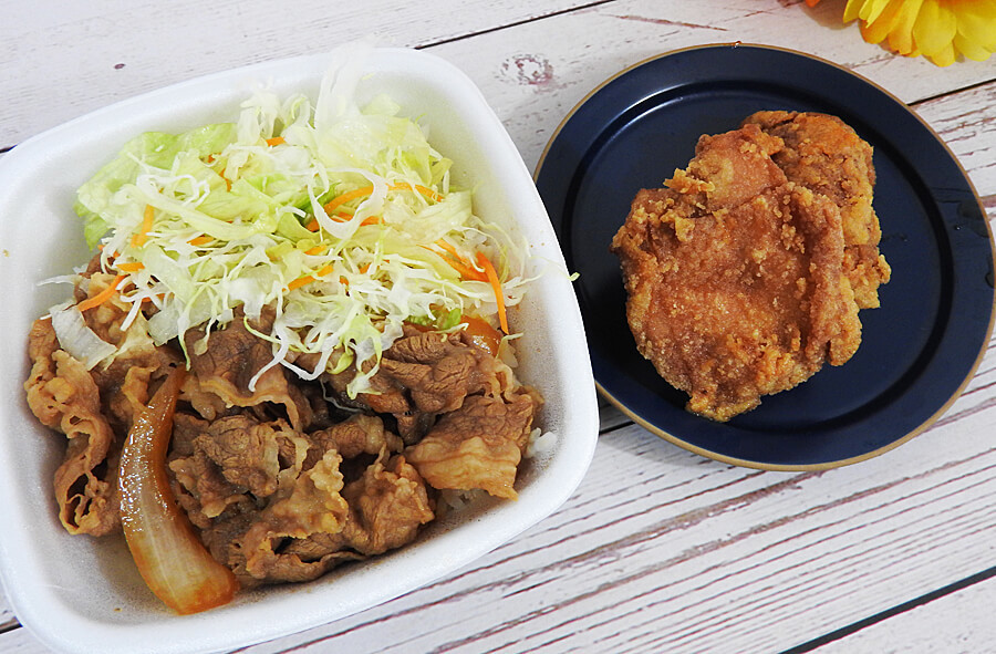 「牛丼とから揚げどちらも堪能できるなんて最高!」と感じていました。しかし、実際に食べてみるとから揚げの方が味が濃かったため、牛丼の味がかすんでしまいました。牛丼がまずいというわけではなく、から揚げに比べて存在感が薄いのです。