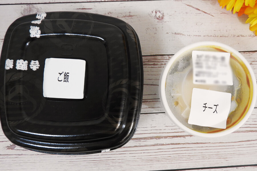 テイクアウトから食べるまで30分程の時間が経過してしまったせいか、チーズがものすごい勢いでかたまっていました。何度か吉野家でチーズカレーをテイクアウトして食べていますが、いつもかたまってますね……。しかし、カレールウの中で混ぜるとチーズがほぐれていきます。