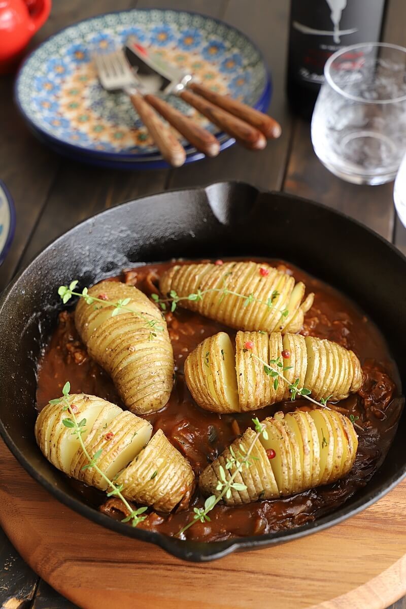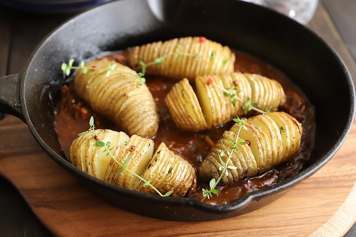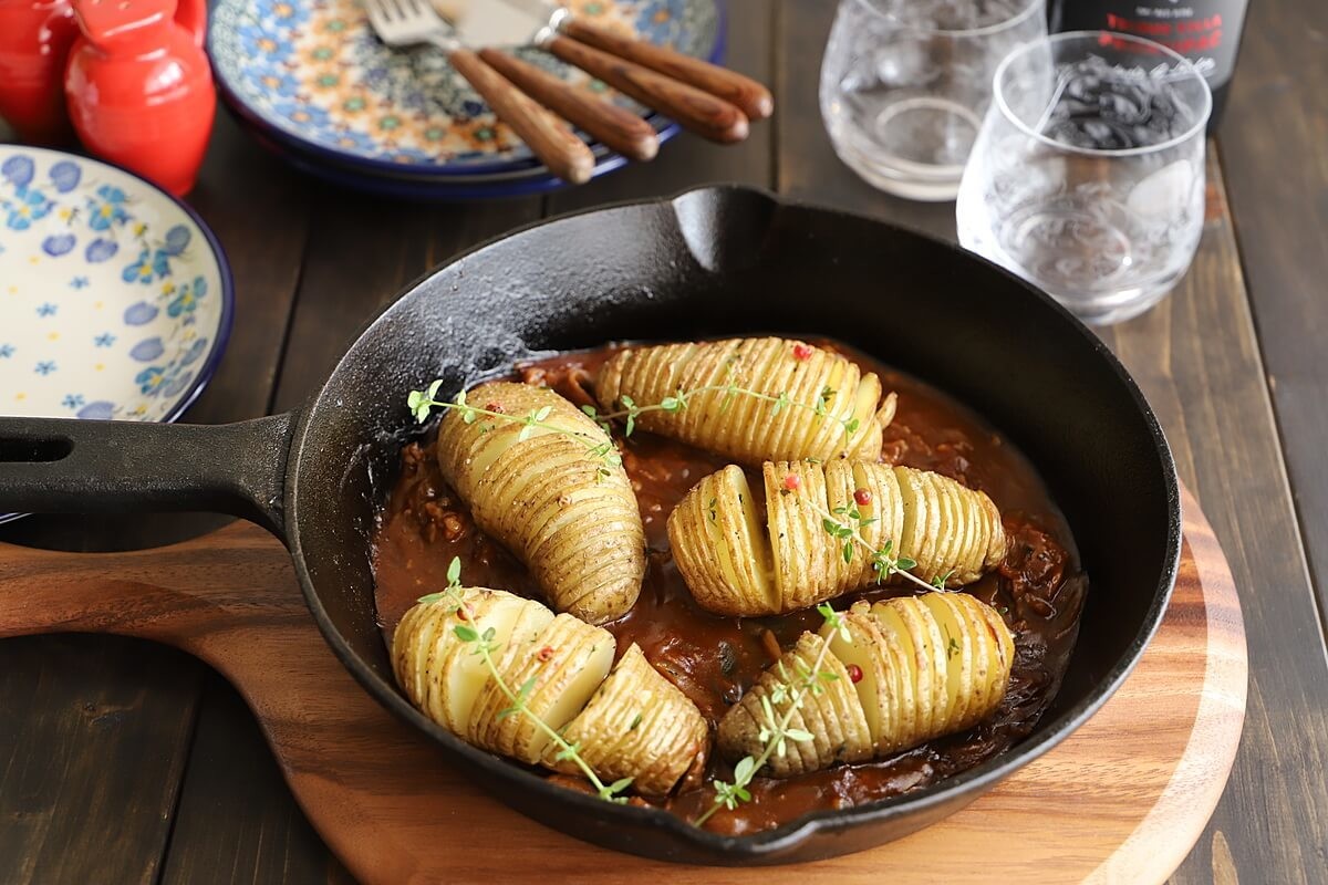 SNSでブームになったハッセルバックポテトにハッシュドビーフを合わせた、簡単にできて見映えのする1品です。