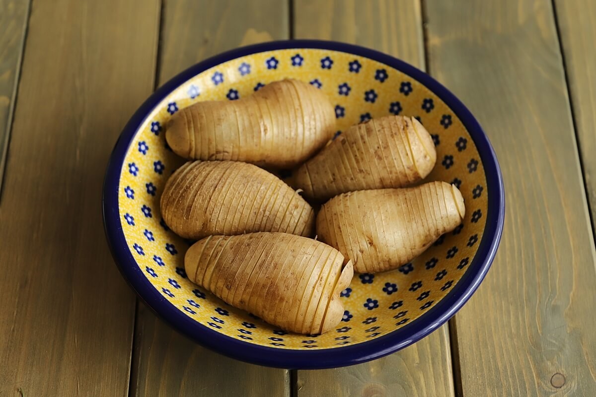 ①メークインはよく洗い、5mm幅ほどに切れ目を入れます。この時、最後まで包丁は入れず、つながっているようにします。横向きに置いたメークインの奥側と手前側に菜箸を置いて下まで包丁がいかないようにすると便利です。