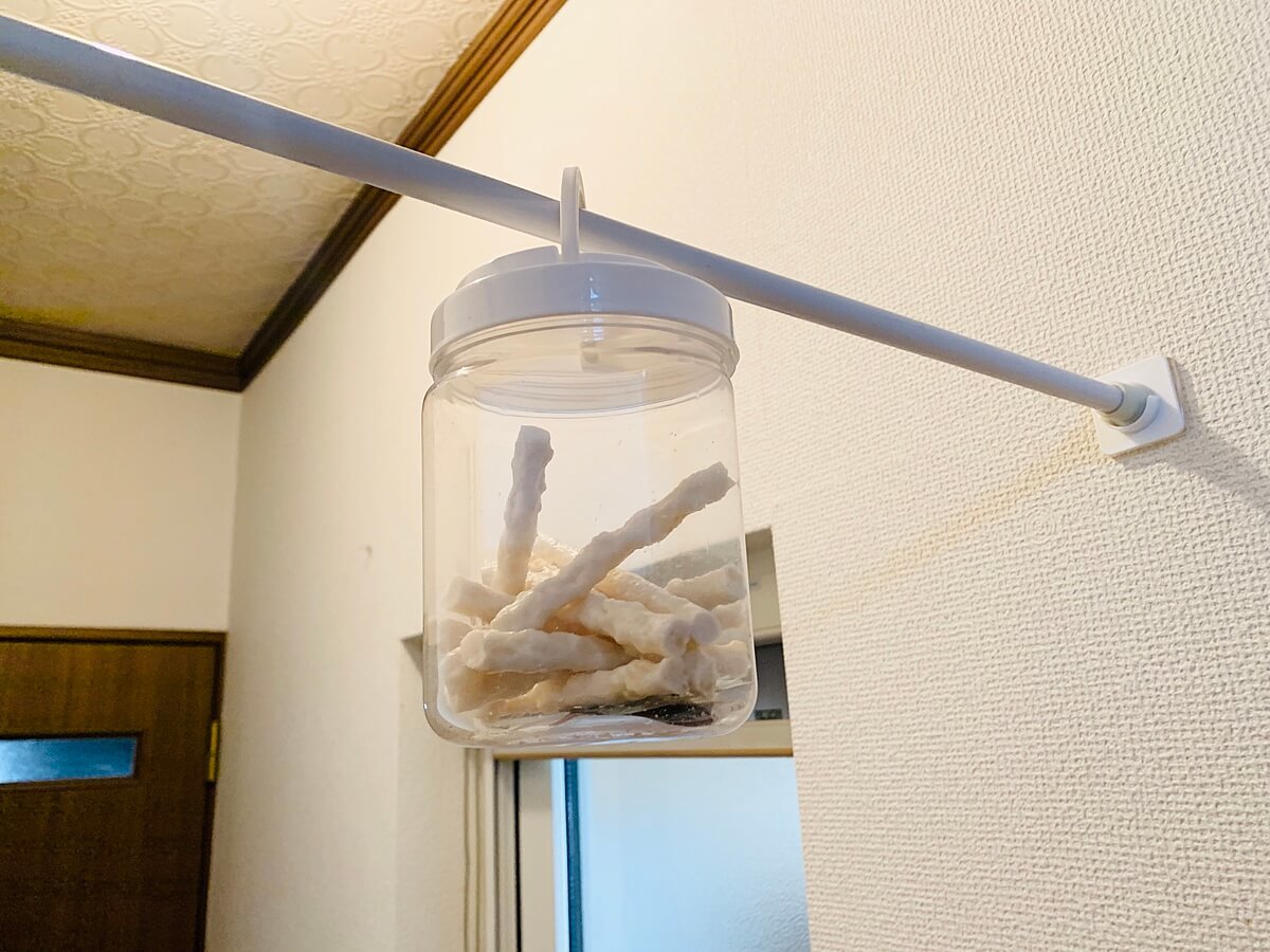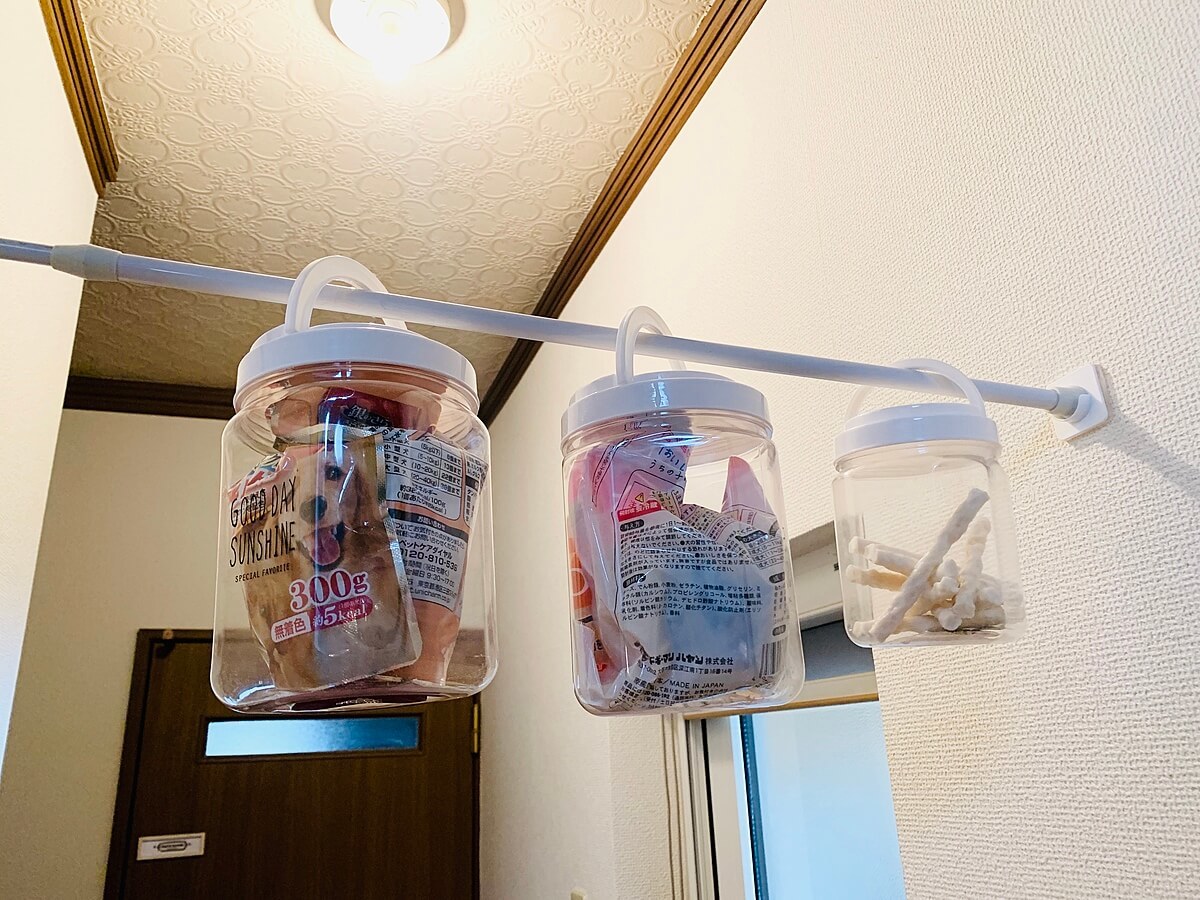 そこで、さすがにジャンプしても届かないように、この突っ張り棒の場所に、ダイソーで購入した容器に犬達のおやつを入れ替えぶら下げてみました。