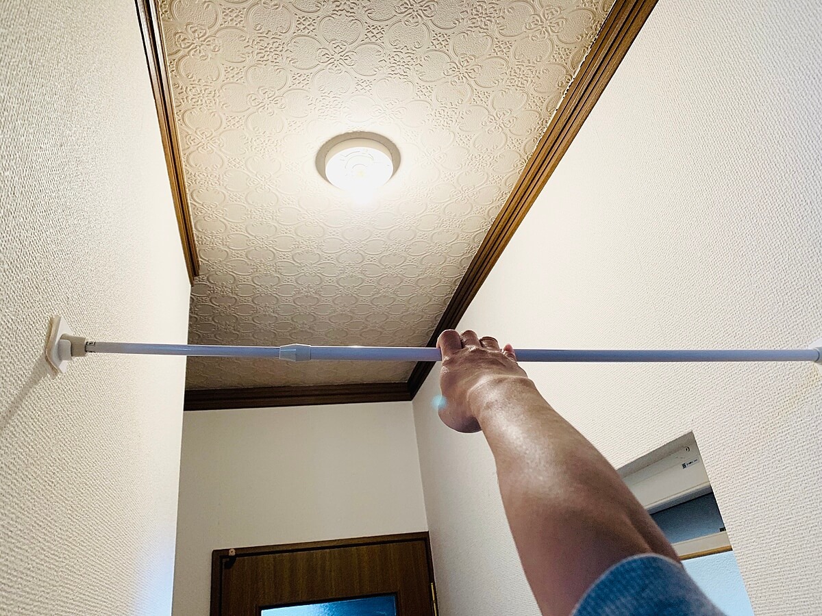 突っ張り棒を回して壁に突っ張ります。