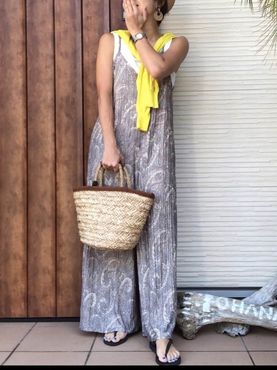 カゴバッグとヌーディなビーチサンダルで夏ムードを盛り上げて、季節感のあるバカンスコーデが出来上がり。