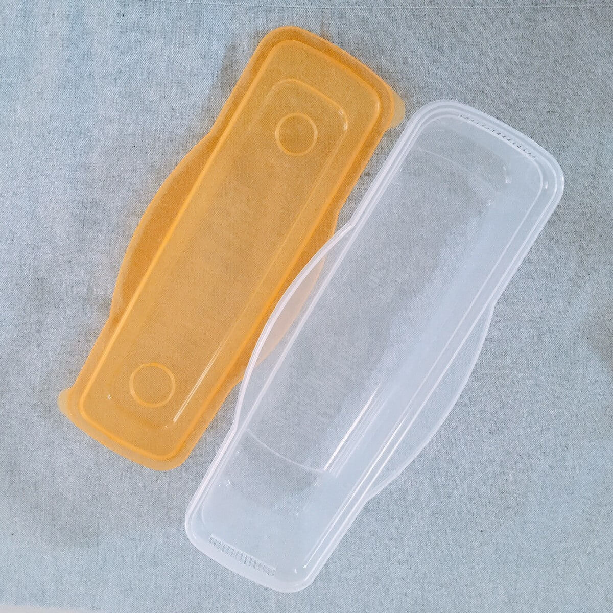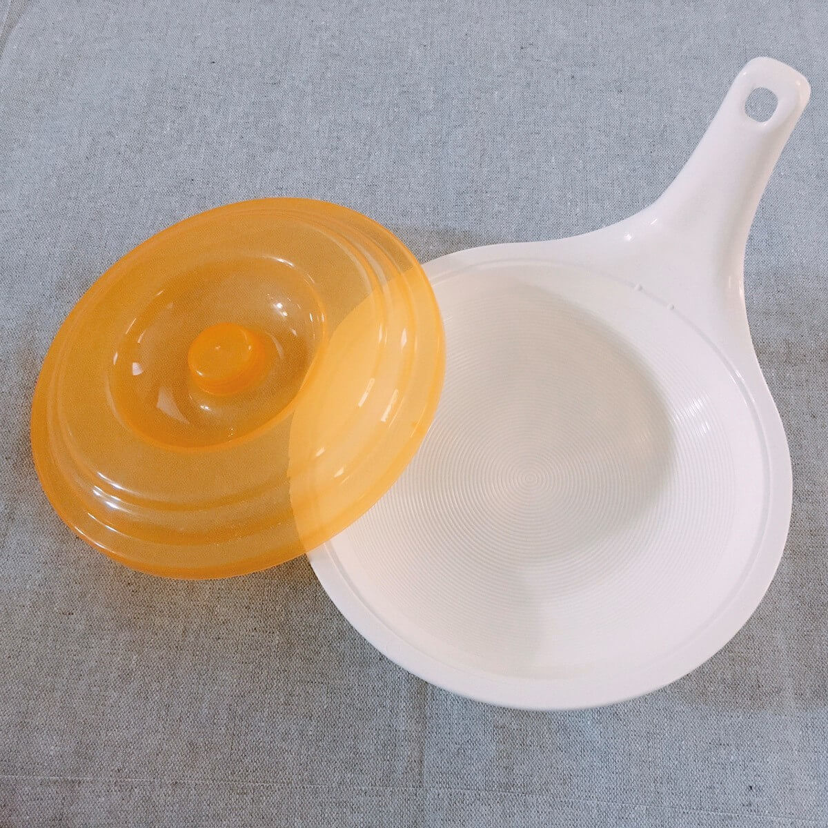 オレンジ色の蓋と、透明な茹で調理容器に分かれています。