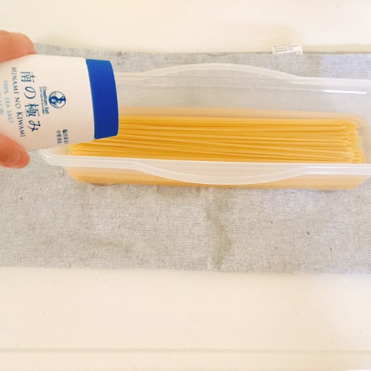 パスタを容器に入れて、容器の内側についている水位線まで水を注ぎ、塩を小さじ1/2投入!