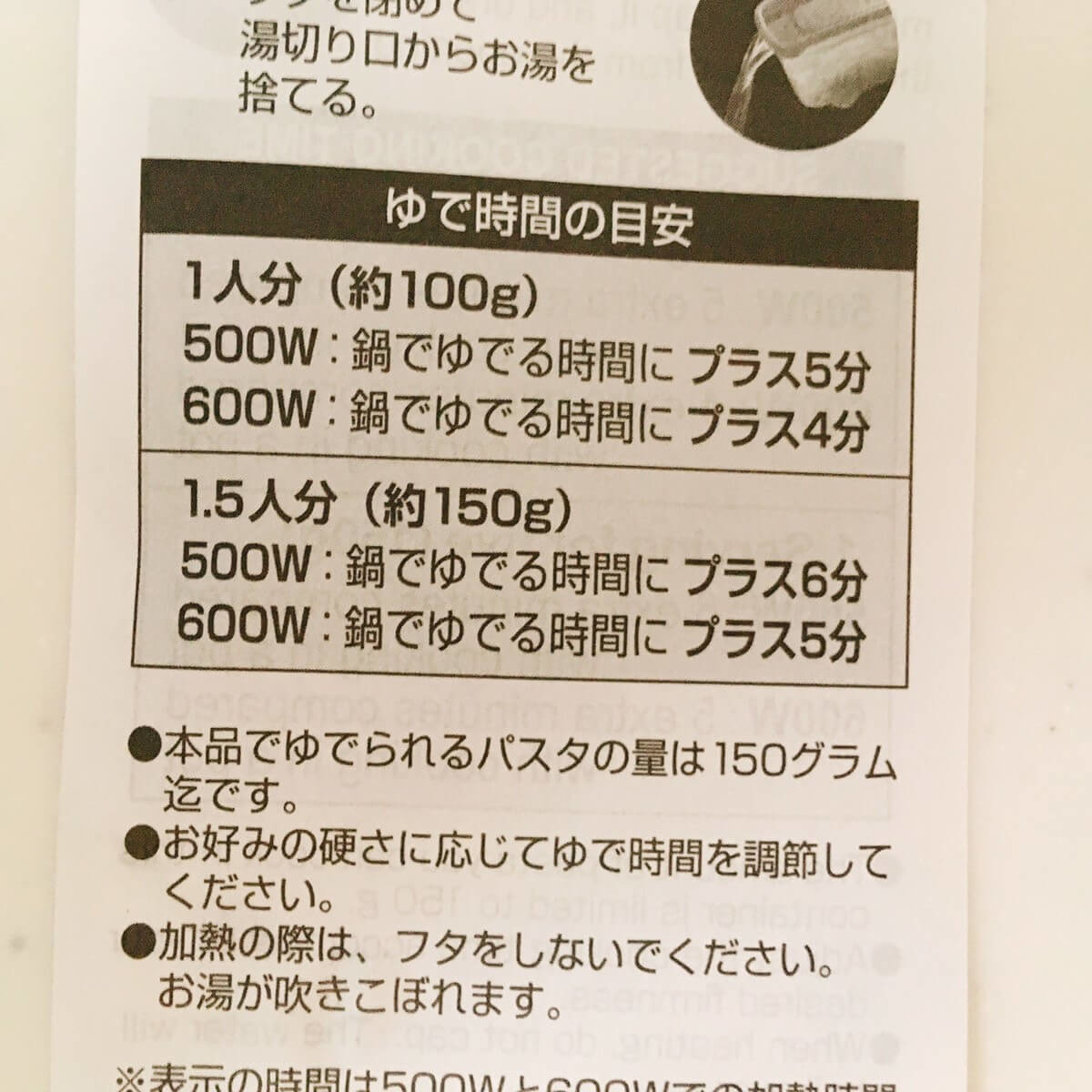 私が今回使ったパスタは、通常の茹で時間が7分、150g調理したので、600Wで12分温めました。