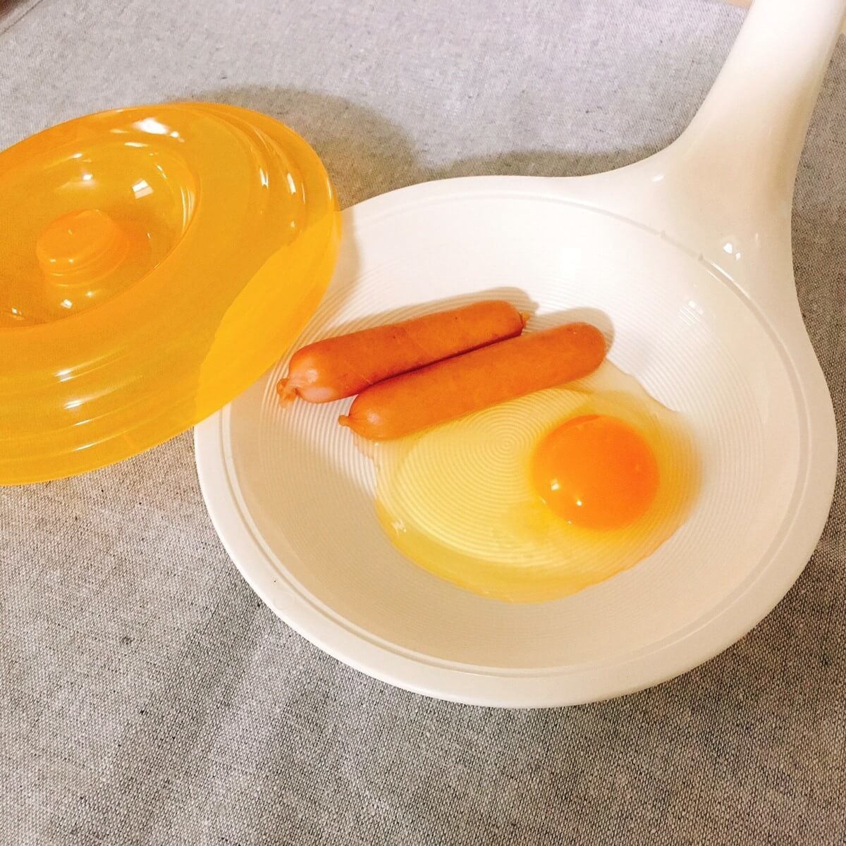 そして説明書どおり、容器に卵を割り入れて、こちらも、つまようじで黄身に何か所か穴を開けて、卵が爆発するのを防ぎましょう!
