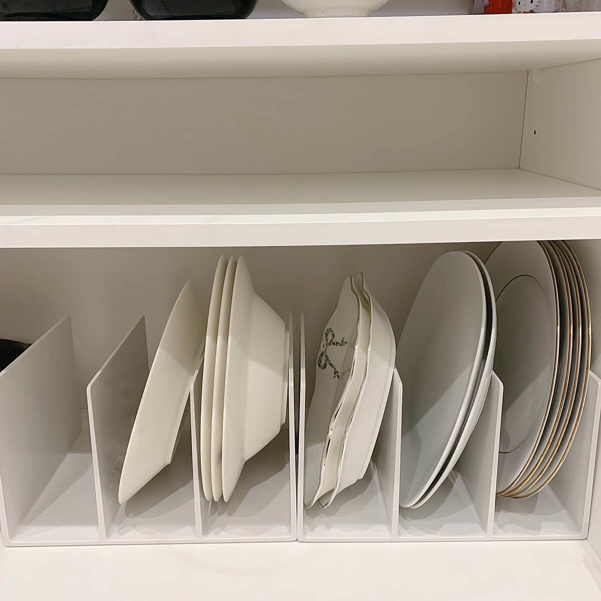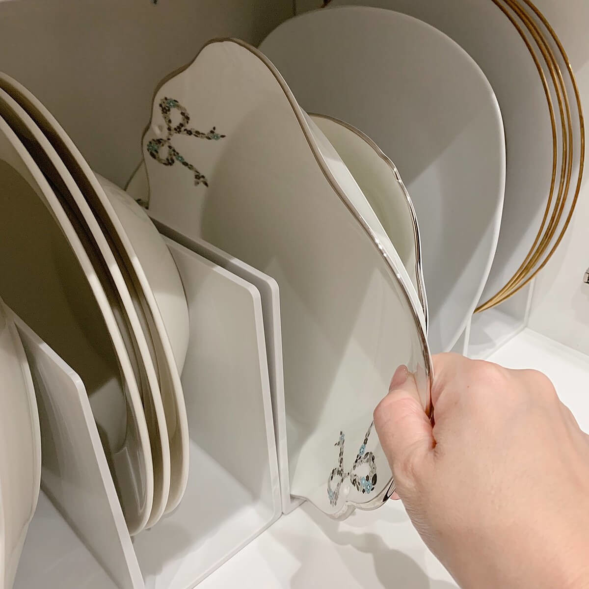 お皿を種類ごとに仕切りスタンドに立ててみました。 仕切りスタンドがしっかりしているので大きなお皿を立ててもグラついたりはしませんでした。