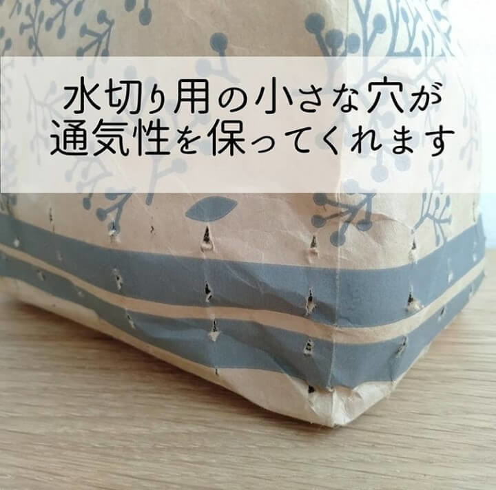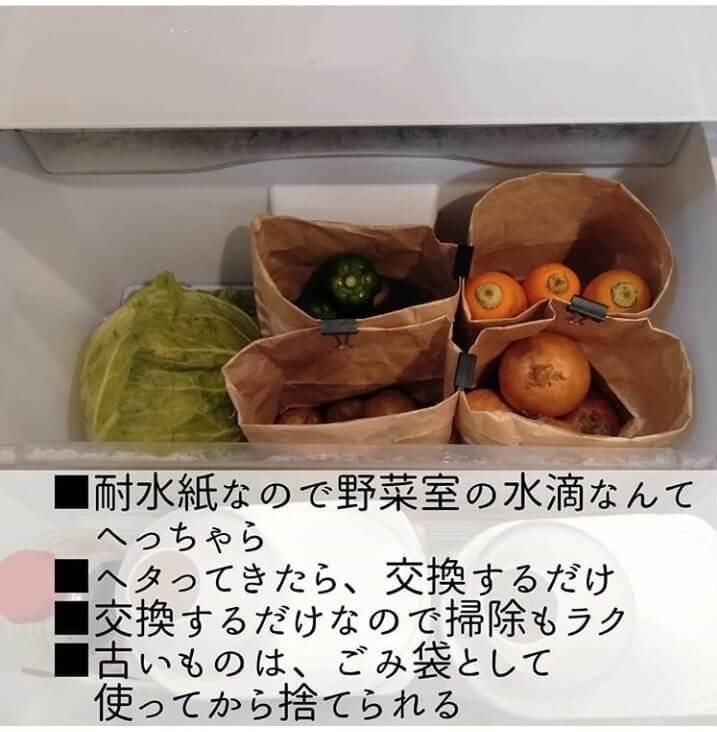 「冷蔵庫の野菜室を仕切るのに紙袋を使っています。『紙製水切りゴミ袋』なら耐水ペーパーなので少しぐらいぬれても全然破れないし、水切り用の小さな穴が通気性を保ってくれ、野菜の保存にぴったり。へたってきたらごみ袋として再利用できるので、節約にもなります♪」@nagomyさん(夫、長男7歳、次男5歳、長女2歳の5人家族)