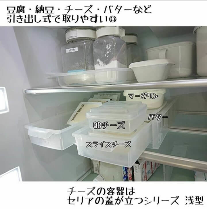 「冷蔵庫は奥の方は取り出しづらいので、引き出し式に。半透明ならどこに何が入っているか家族にもわかりやすいです。埋もれやすいハムやベーコンもケースに入れて立てて収納。とっても使いやすくなりました!」@akko.2no3さん