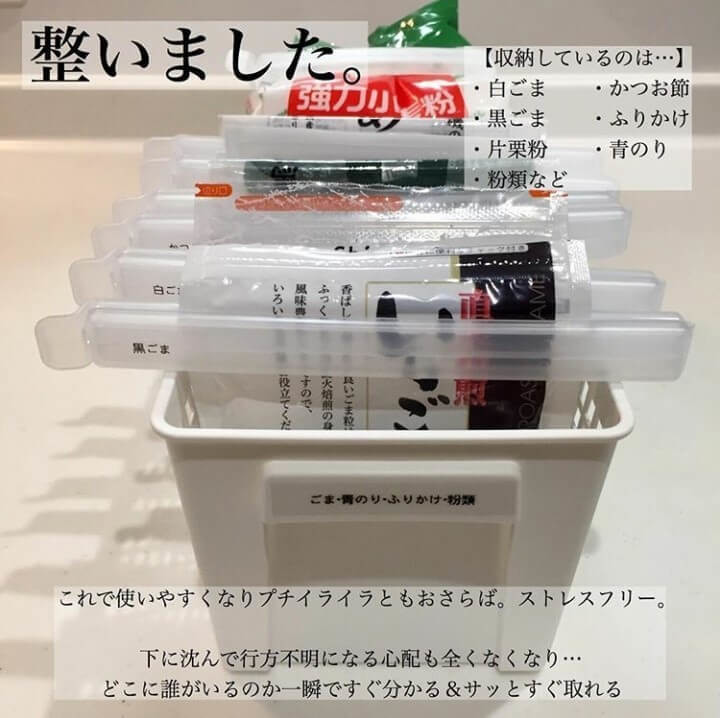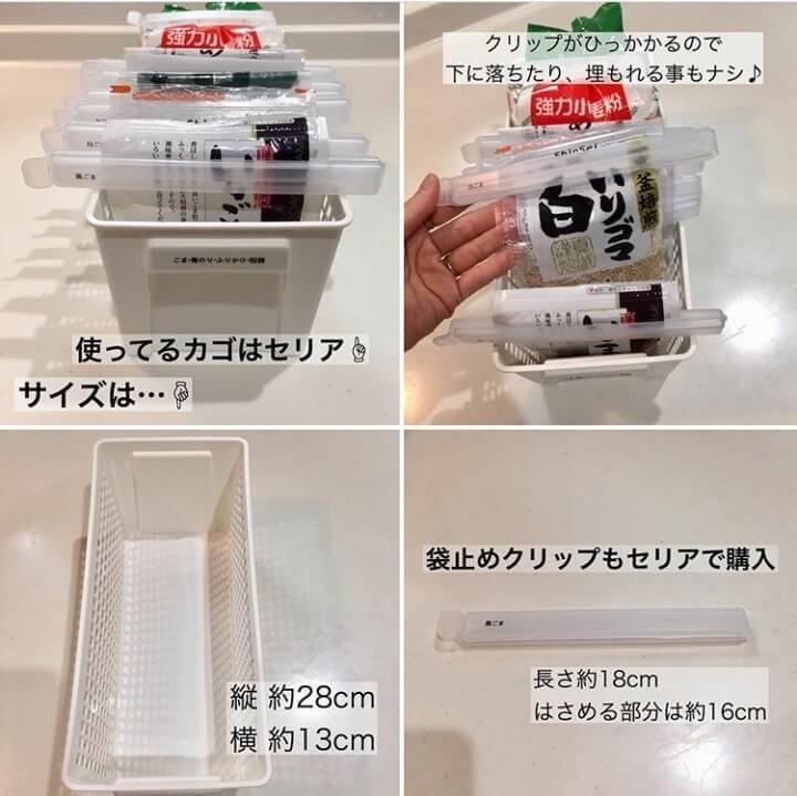 「ごまや青のり、片栗粉など、自立しない袋ものは、ドアポケットに入れがちですが、牛乳やボトル類に踏まれて、いざ使いたいときに見つからないなんていうことも。そこで、このカゴと『袋止めクリップ』を組み合わせたら行方不明がなくなり、プチストレスからも解放されました!」@memimemi19.2.5さん(夫、長男3歳の3人家族)