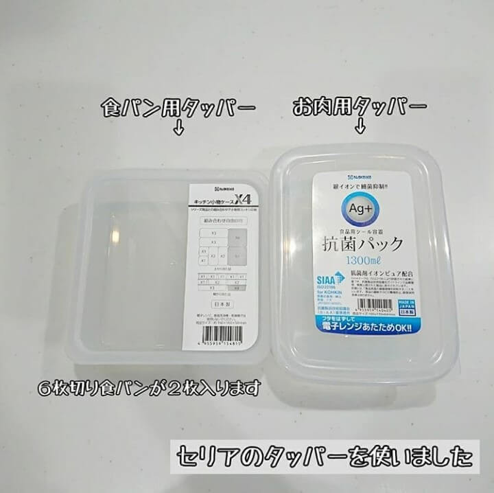 「冷凍庫収納は倒れたり埋もれたりすると、使い忘れて消費期限が切れてしまうことも。セリアで見つけたジャストサイズの容器なら、見やすいだけでなく、スペースをムダにせず収納できるし、パンもお肉も自家製冷凍も、つぶれたり変形したりしません。ただ冷凍用の商品ではないので、自己責任で使っています。」@akko.2no3さん