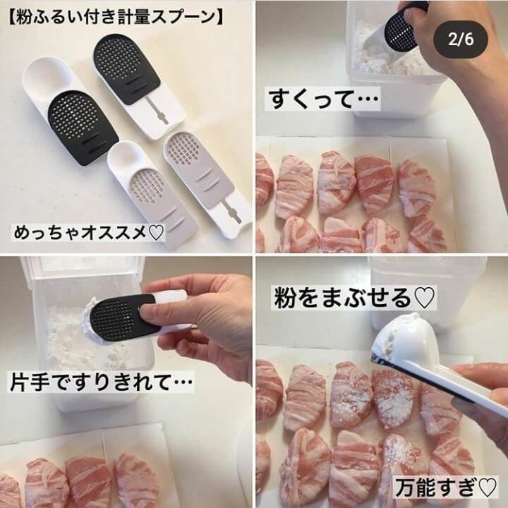 「『片手で簡単!すりきり計量スプーン』は粉ふるいが付いている計量スプーン。焼いたり揚げたりする前に粉をまぶすとき、これですくってそのまま振りかければ、必要な分だけ使えるので、粉をムダにしません!」@memimemi19.2.5さん