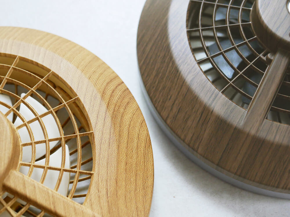 方向自在でしっかり明るい1200lm。木目柄がオシャレでお部屋とも馴染むので、インテリア性も兼ね備えている、小さなシーリングファンライトをご紹介いたします。