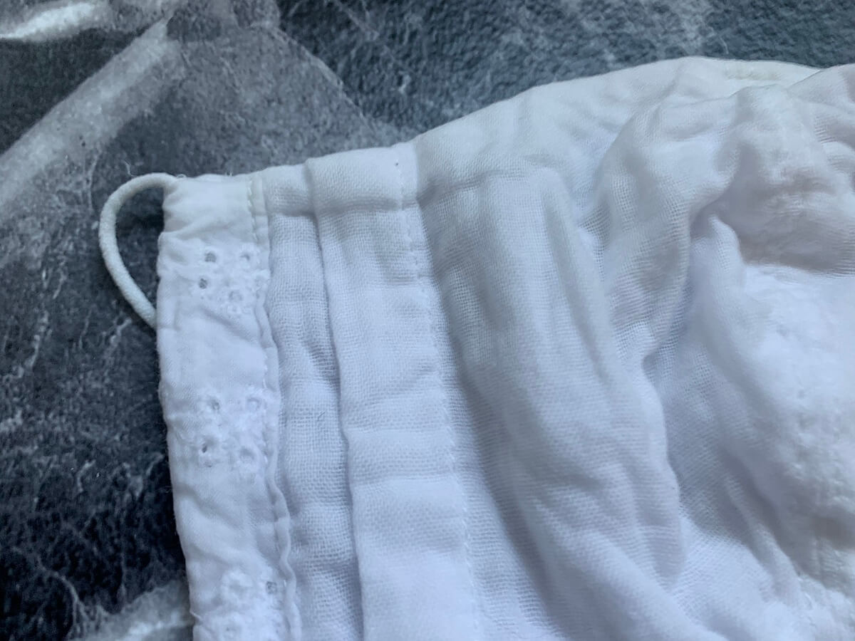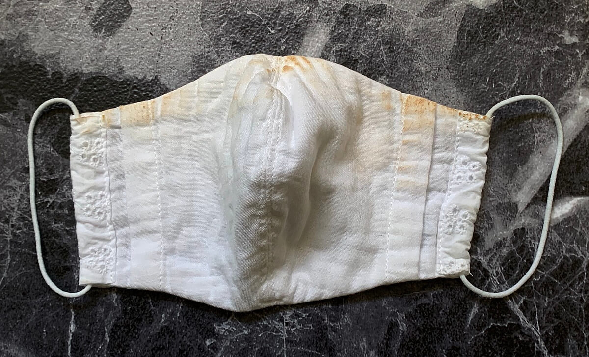 恥ずかしながらお見せするマスクの裏側はファンデーションだらけ。せっかくの白いマスクも台無しです。