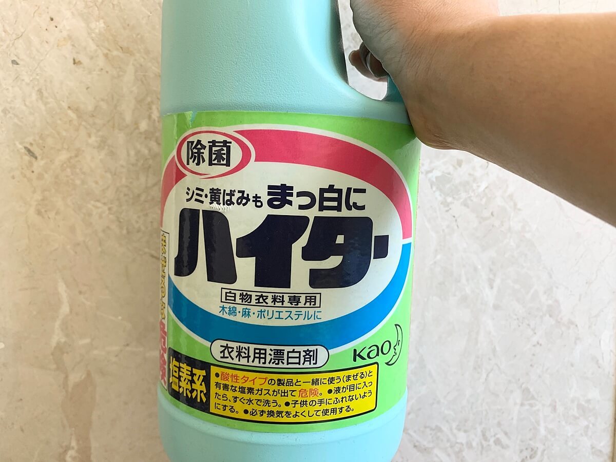 シミのようなものも気になり、真っ白にしたくて自宅にある塩素系漂白剤のハイターで汚れを取ることにしました。
