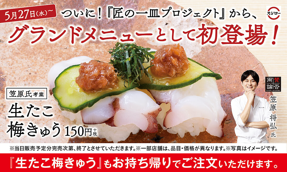 スシローは夏のグランドメニューが好評販売中です!その中で、“回転すしの常識を超える逸品”として、約80万食を売り上げた「生たこ梅きゅう」が、定番商品として登場しています。