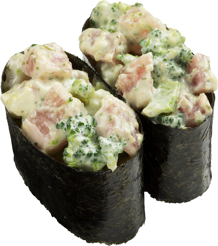 「パンチェッタブロッコリー軍艦」は、ミネラル豊富な天日塩で塩漬けにし、肉の旨味を引き出したパンチェッタを使用し、店内で茹でたブロッコリーと和えた、サラダ感覚で食べられる創作すしです。
