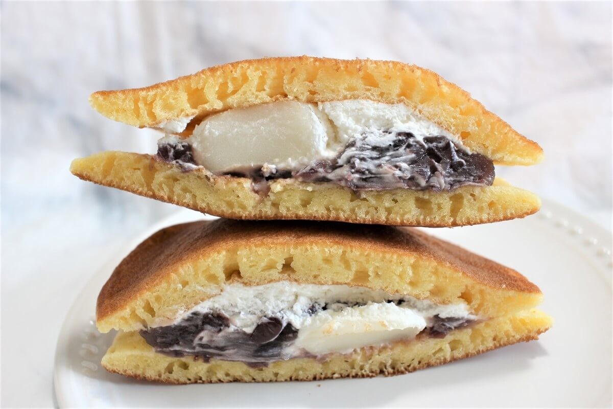 もちもち食感のどら焼き生地に、白玉と粒あん、ホイップクリームが挟まれたどらやきです。
