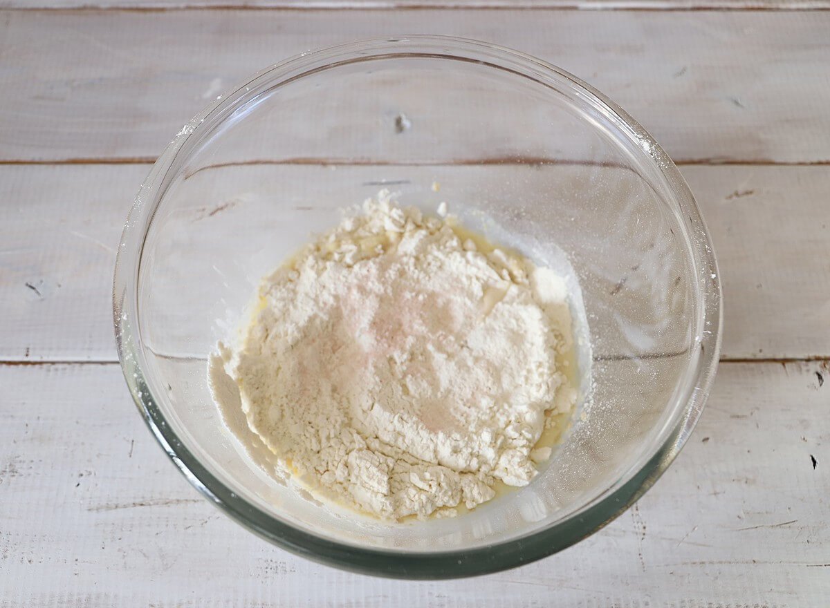 ⑤強力粉、塩を入れ、粉けがなくなるまで菜箸などでぐるぐるとよく混ぜ、ひとまとめにします。