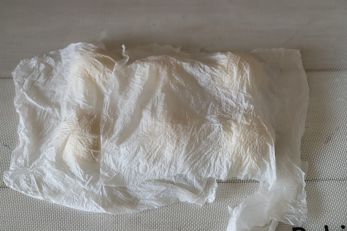 ⑨ 水に濡らして固く絞った濡れ布巾をかけ、そのまま15分置きます。濡れ布巾ではなく、水にぬらし固く絞ったキッチンペーパーでも代用できます。固く絞った後、気を付けながらそっと広げないと、写真のように破けます(笑)。