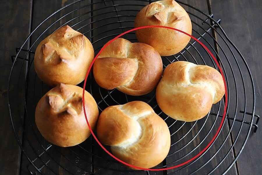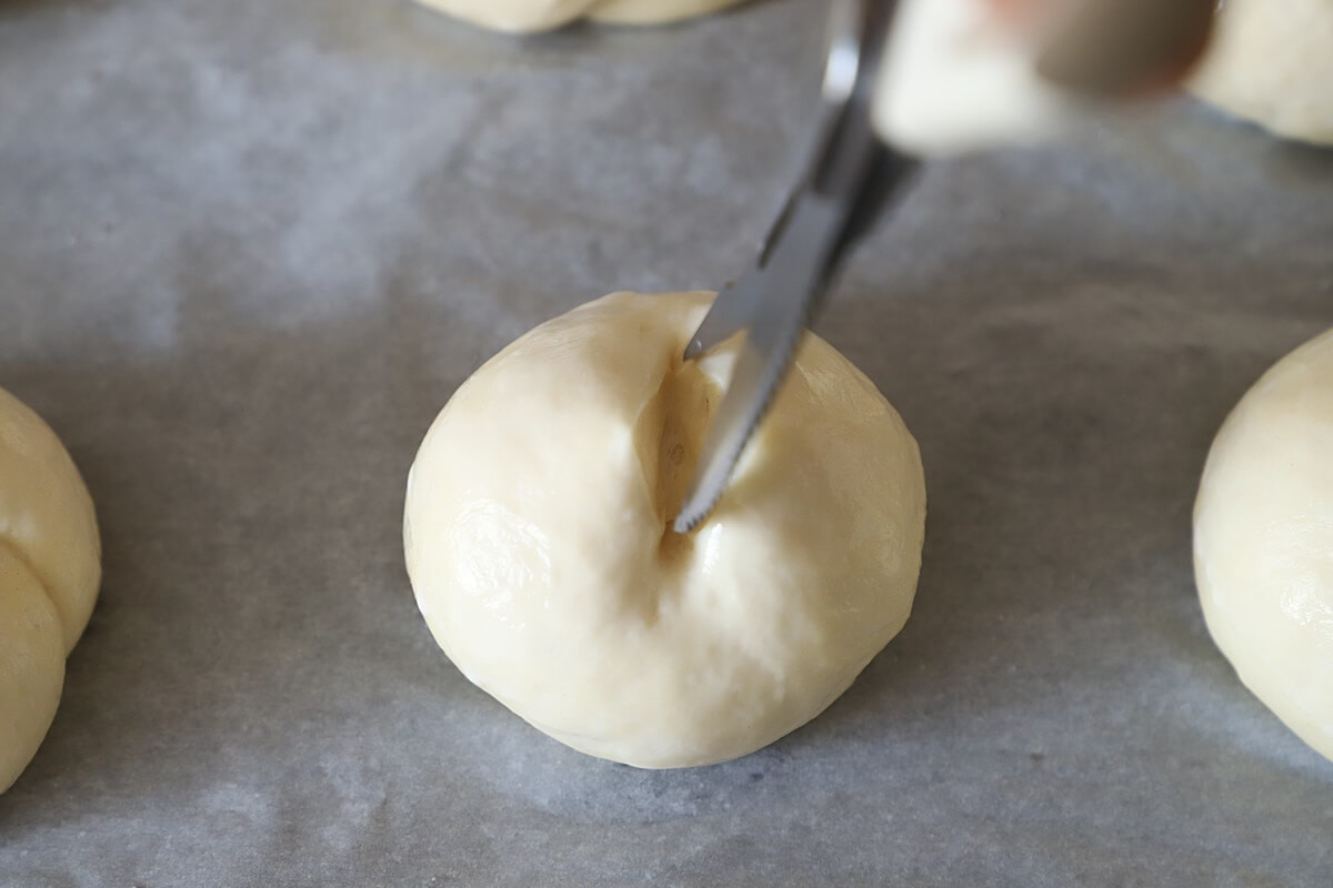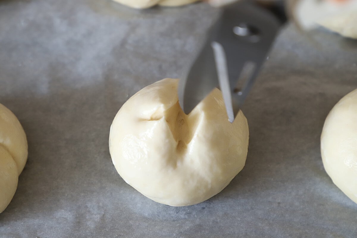 ⑬オーブンに入れる前に丸パンにはさみを入れます。