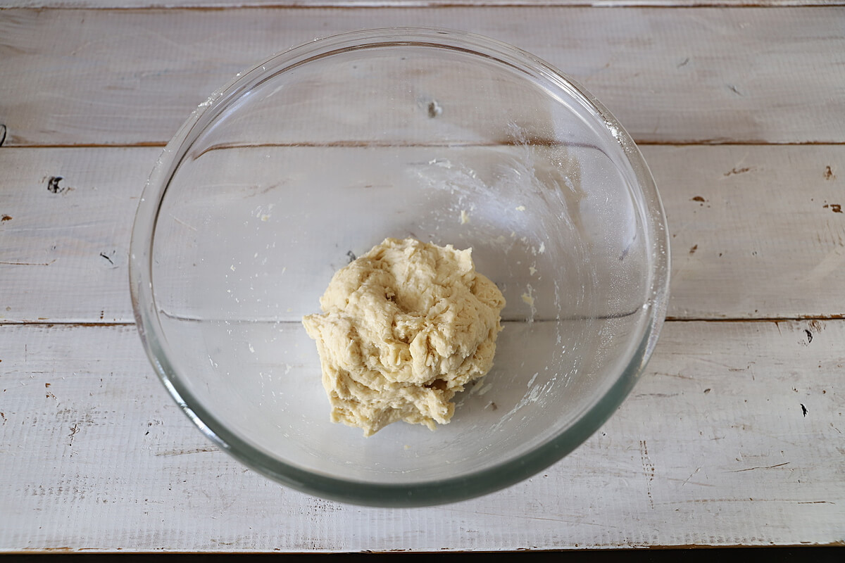 ⑥そのままボウルの中で、手の平で押して、たたみ、押して、たたみ、を1分ほど繰り返し、まとめます(やわらかい生地ですので手につきますが、最後に手についたものもとってつけます)。