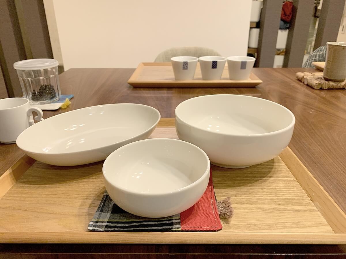 楕円皿は端が少し深さがあるので煮つけ魚やパスタ、チャーハンなどに使えます。 小さなボウルは鍋の取り椀にも惣菜にもデザートにも使える大きさ。