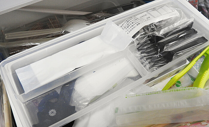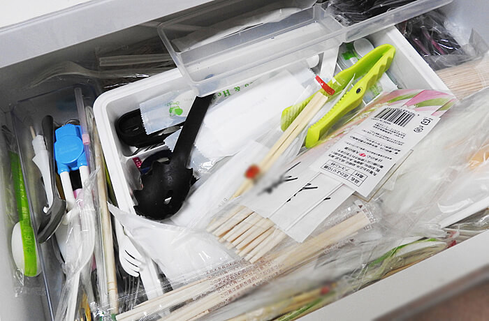 もう使っていない子どもの補助箸やら調理用品、飲食チェーン店やコンビニでお持ち帰りした時にいただいたわりばし……とにかく無造作に入っています。