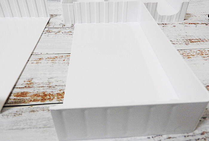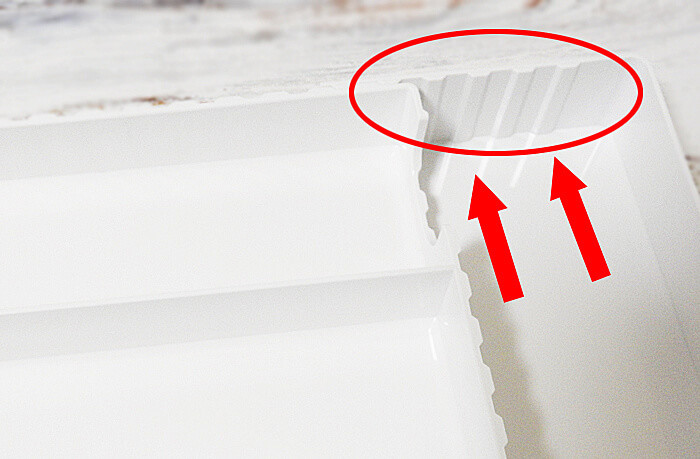 ボコボコの部分を嚙み合わせて幅or奥行きを調節していきます。ボコボコしていることで、中央部分の収納ケースとコの字型の収納ケースがしっかりとはまるのでいいですね。