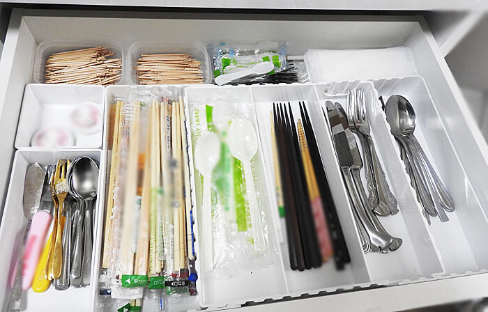 我が家は写真左側からしか台所へ入れない構造なので、中央部分にわりばしや使い捨てスプーンなどを入れて左側に子どもが使う小さなスプーンやお箸、右側の3つは夫婦のカトラリー置き場にしましたよ。