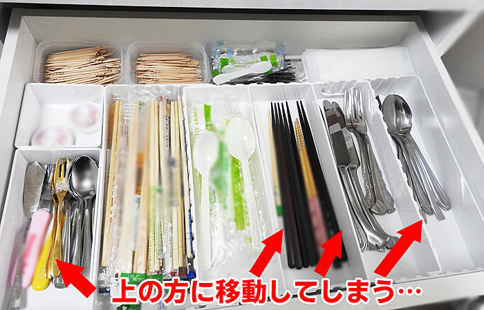 スキットの奥行が長すぎるのか我が家のカトラリーが短すぎるのかわかりませんが、引き出しを開ける時にカトラリーが上の方に移動するのが気になりました。