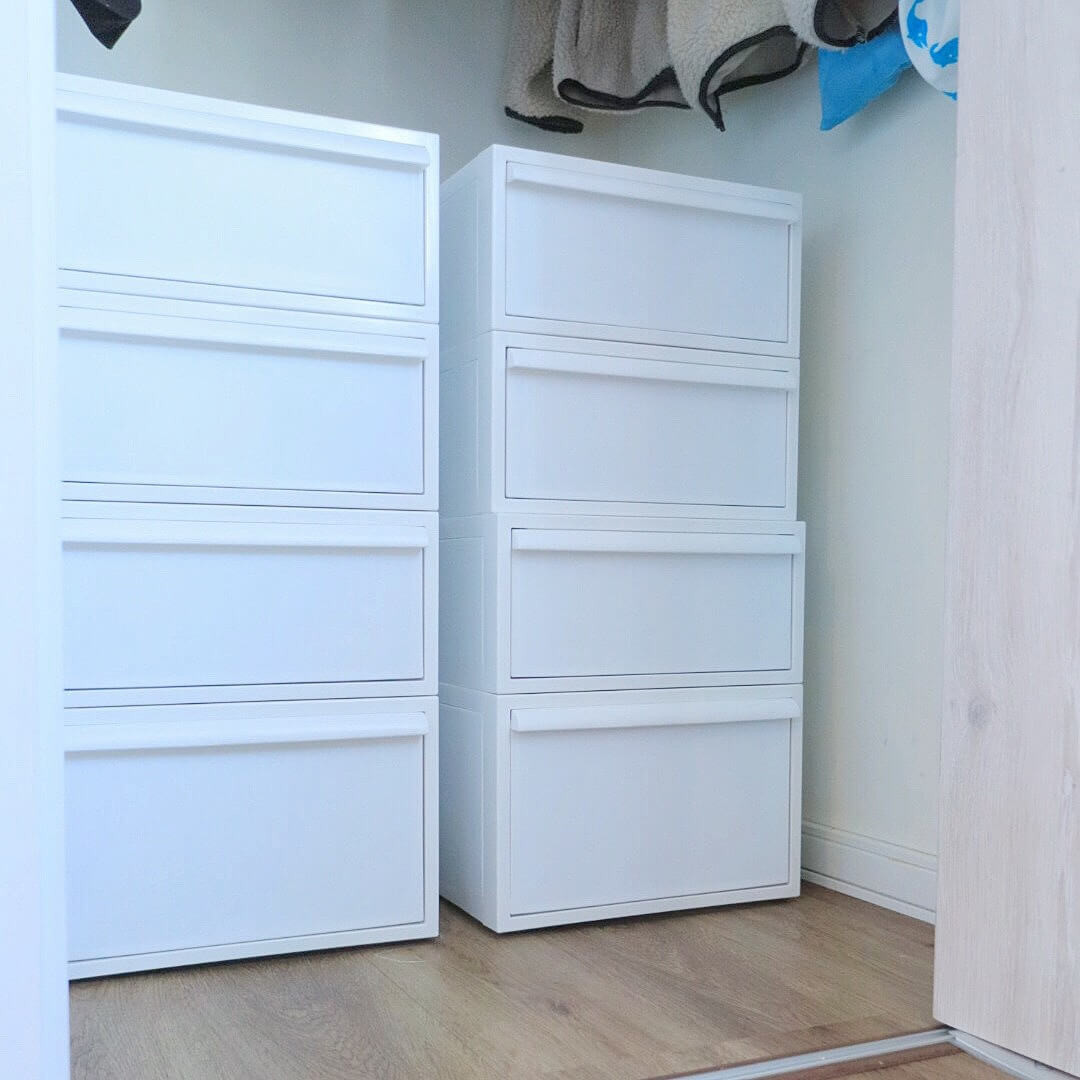 クローゼットに風を通したいので比較的扉を開けていることが多いのですが、こちらのプラケースは見た目がとてもスッキリしていて、開けっぱなしでも全然大丈夫!