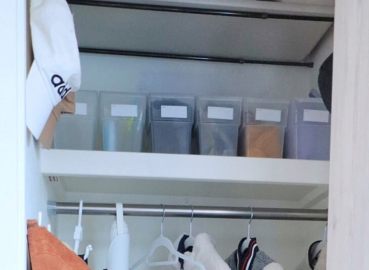 クローゼットの上段にある棚には半透明のファイルボックスを並べています。