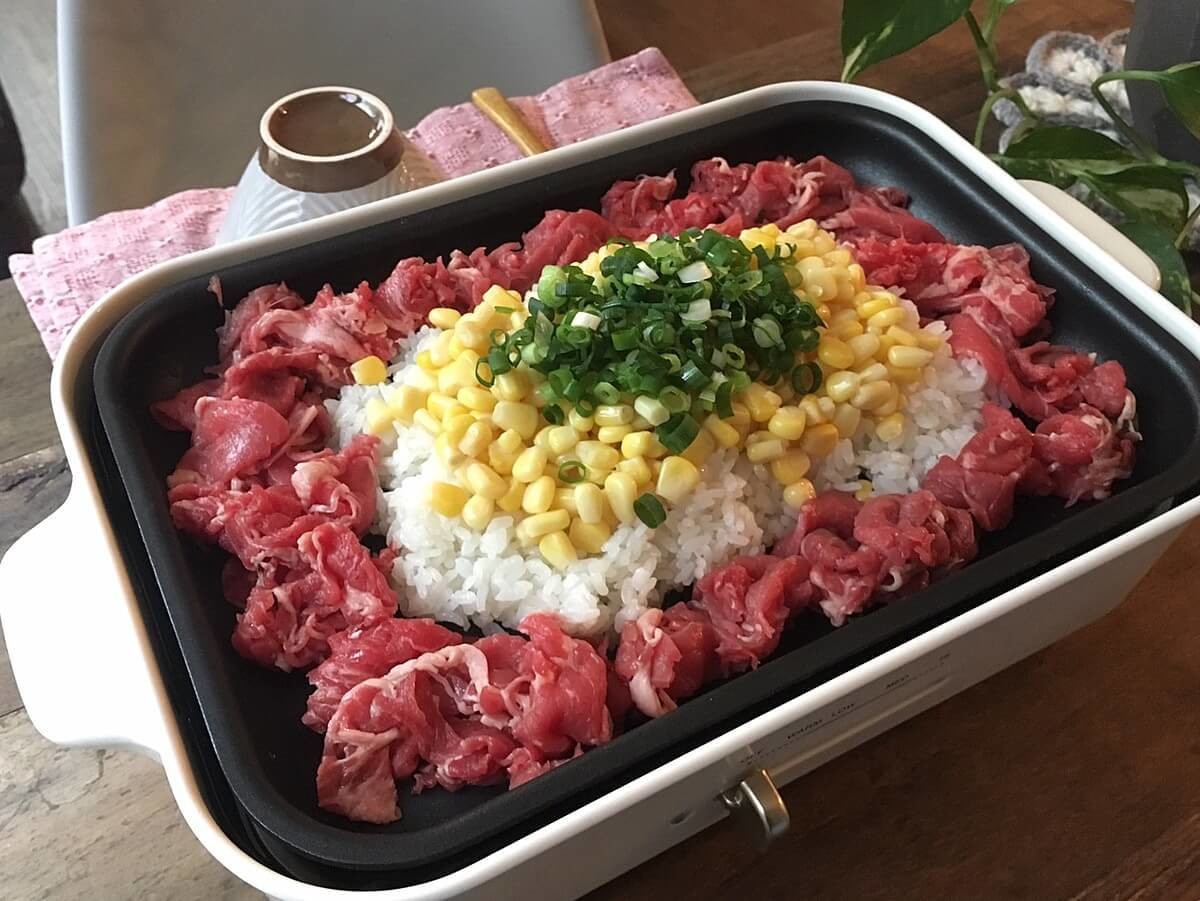 ホットプレートにご飯とその周りに牛肉(今回は焼肉のタレで下味をつけてます)をのせます。