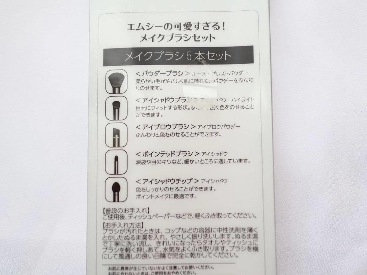 裏面にはブラシの種類や用途の説明が記載されています♪実は以前、他のメーカーの人気メイクブラシセットを購入したのですが、ブラシの種類が多くどのブラシがどんな使い方をするのか全く分かりませんでした。