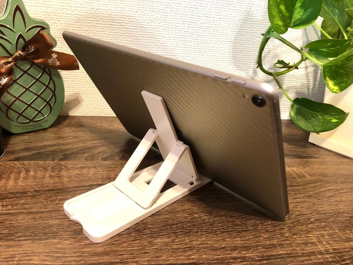 スマホよりタブレット派の方にはタブレットスタンドがおすすめ。畳むと板チョコほどのサイズになるので使わない時も邪魔になりません。持ち運びにも便利です。