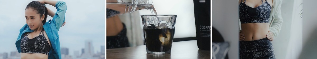 ブランドキャラクターのモデル・Nikiさんが、様々なファッションを鏡でチェックしながら、スタイルキープのためにC COFFEEを飲むシーンを描く「スタイルキープ篇」と、フィットネストレーナー・田辺莉咲子さんのストイックなモーニングルーティーンを終えたあと、冷水で”チャコールアイスコーヒー”を作って休憩するシーンを描く「アイスコーヒー篇」、2タイプを同時公開。