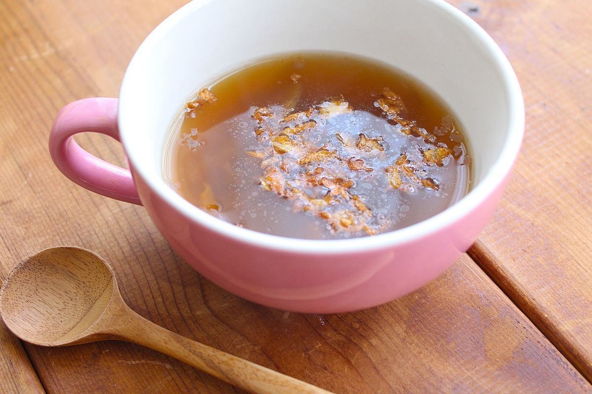 続いて、スープ♪ オニオンコンソメスープにトッピング〜。