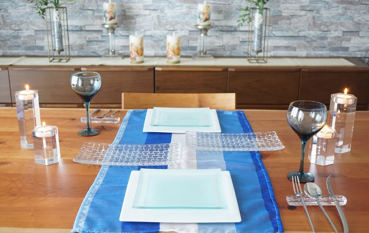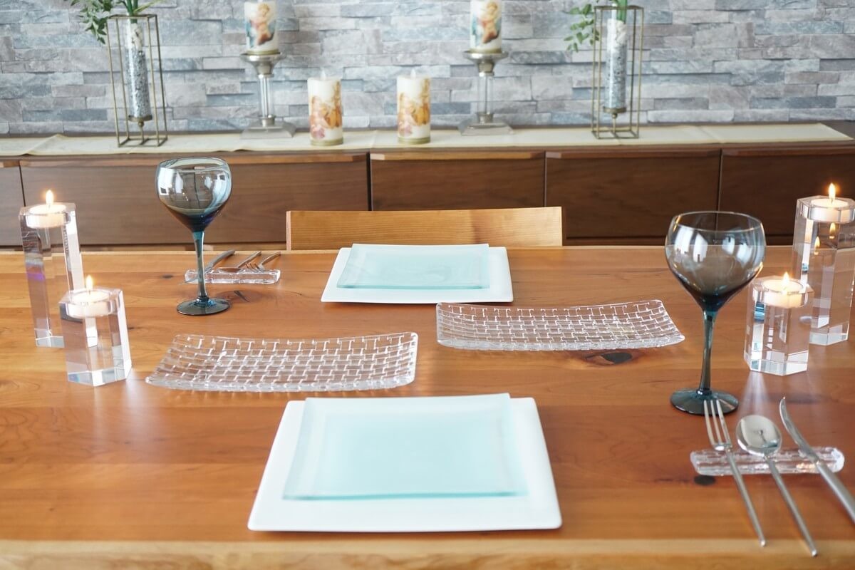 こちらはフリークロスを敷く前のテーブルセッティングです。 食器の位置は一緒ですが、フリークロスを敷くだけで印象が変わりますよね。
