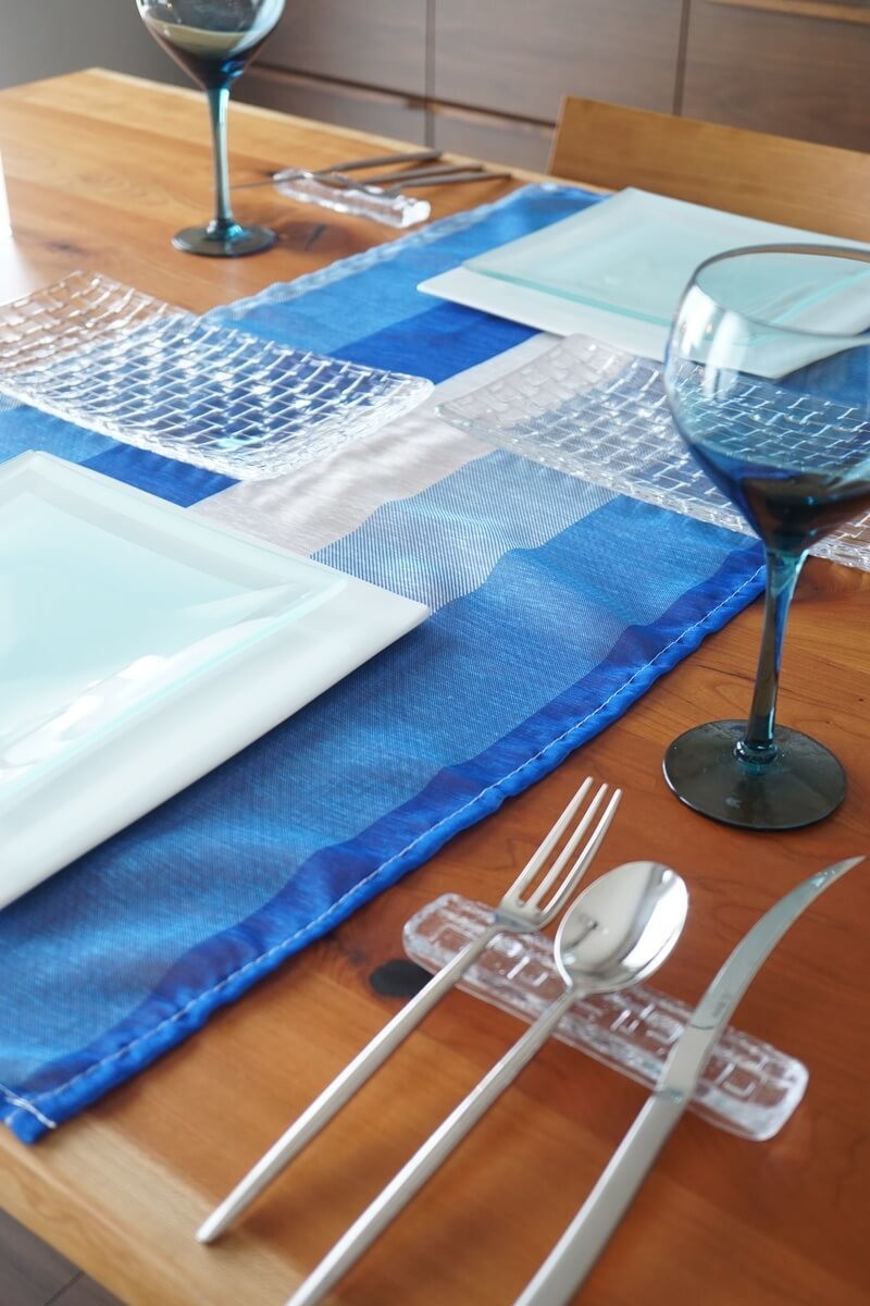 4人用のセッティングの時は両端を少し折り、幅を細くしてテーブルの真ん中に敷くとまた違った雰囲気が楽しめます。