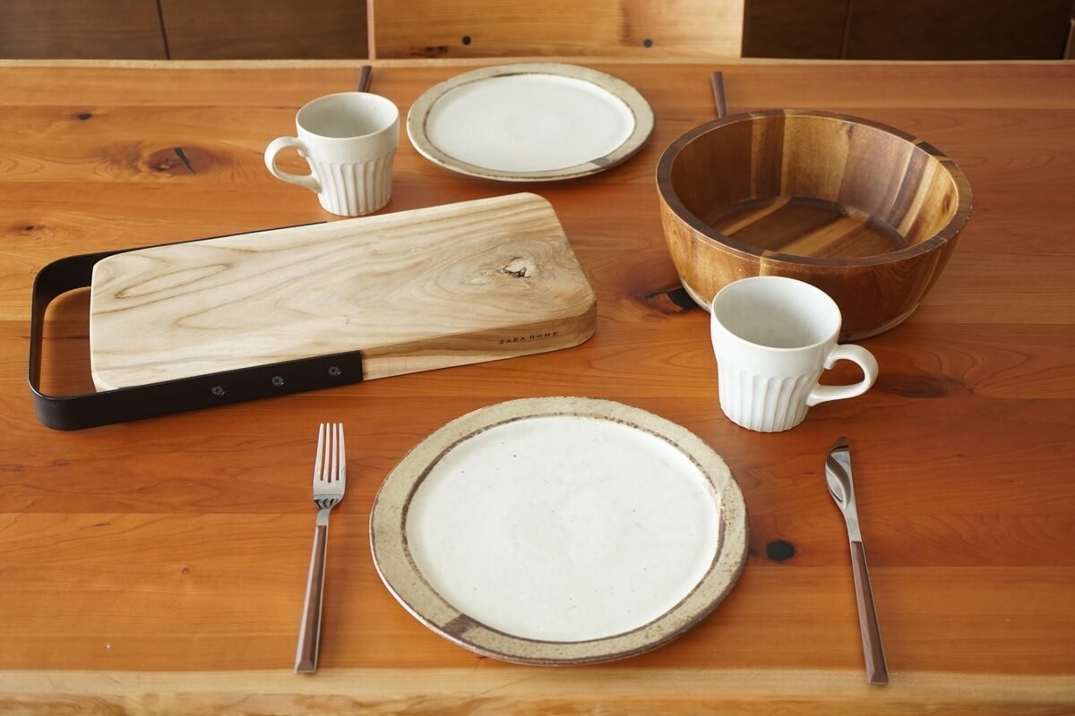 木のテーブルに木製の食器を置くと、同じ色合いなので全体的にぼやけた印象になってしまいます。