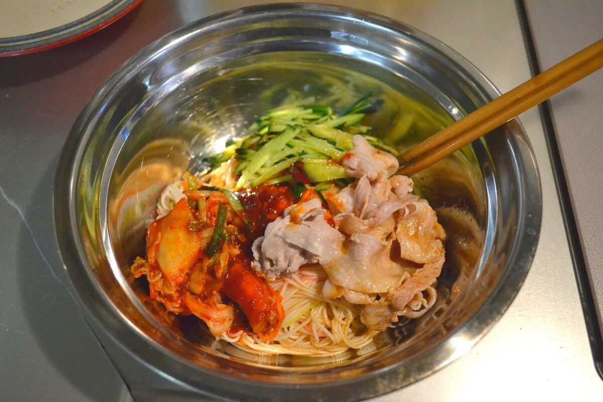 (5)ボウルにそうめん・豚しゃぶ肉・きゅうり・キムチ・タレを入れよく混ぜる