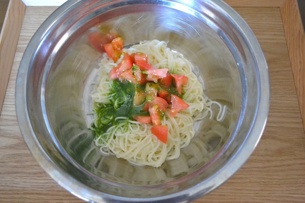 (3)ボウルに(2)のそうめん・角切りしたトマト・バジルソースを入れよく混ぜる