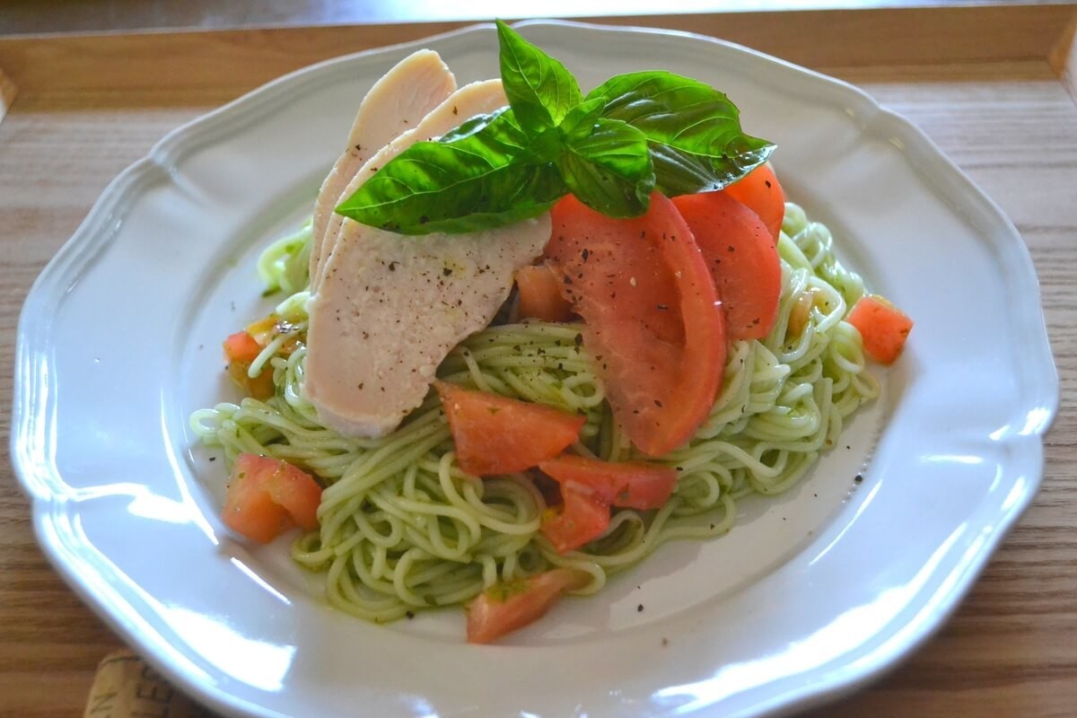 (4)(3)を器に盛りトッピング用のトマト・サラダチキン・バジルをのせ、ブラックベッパーをかけてできあがり