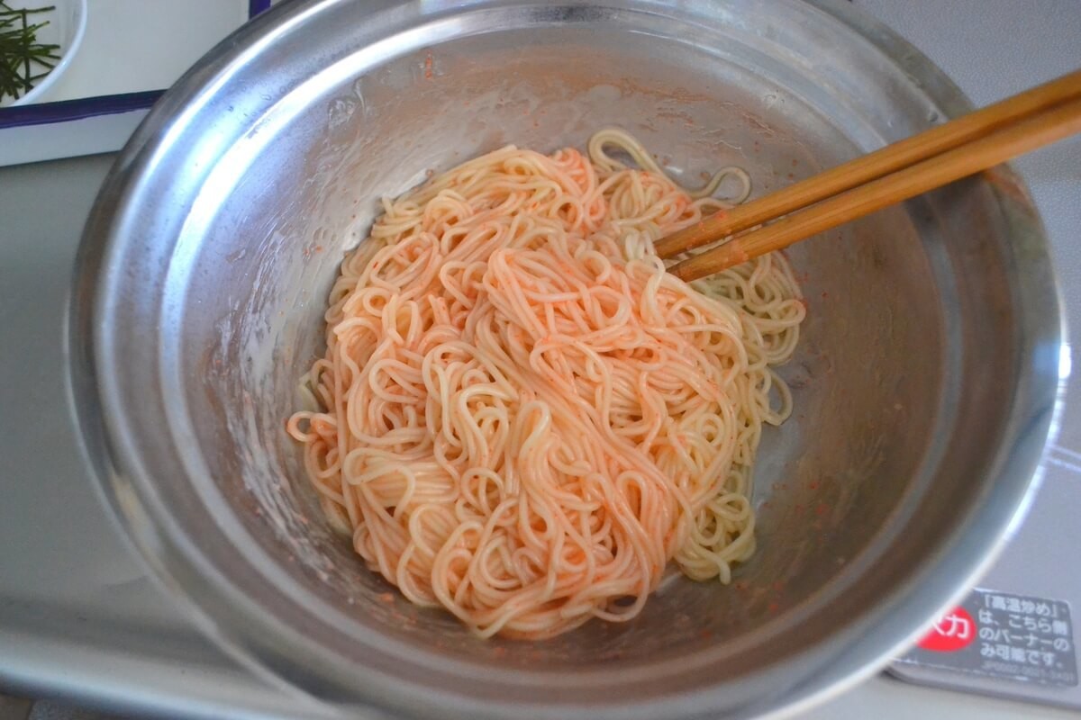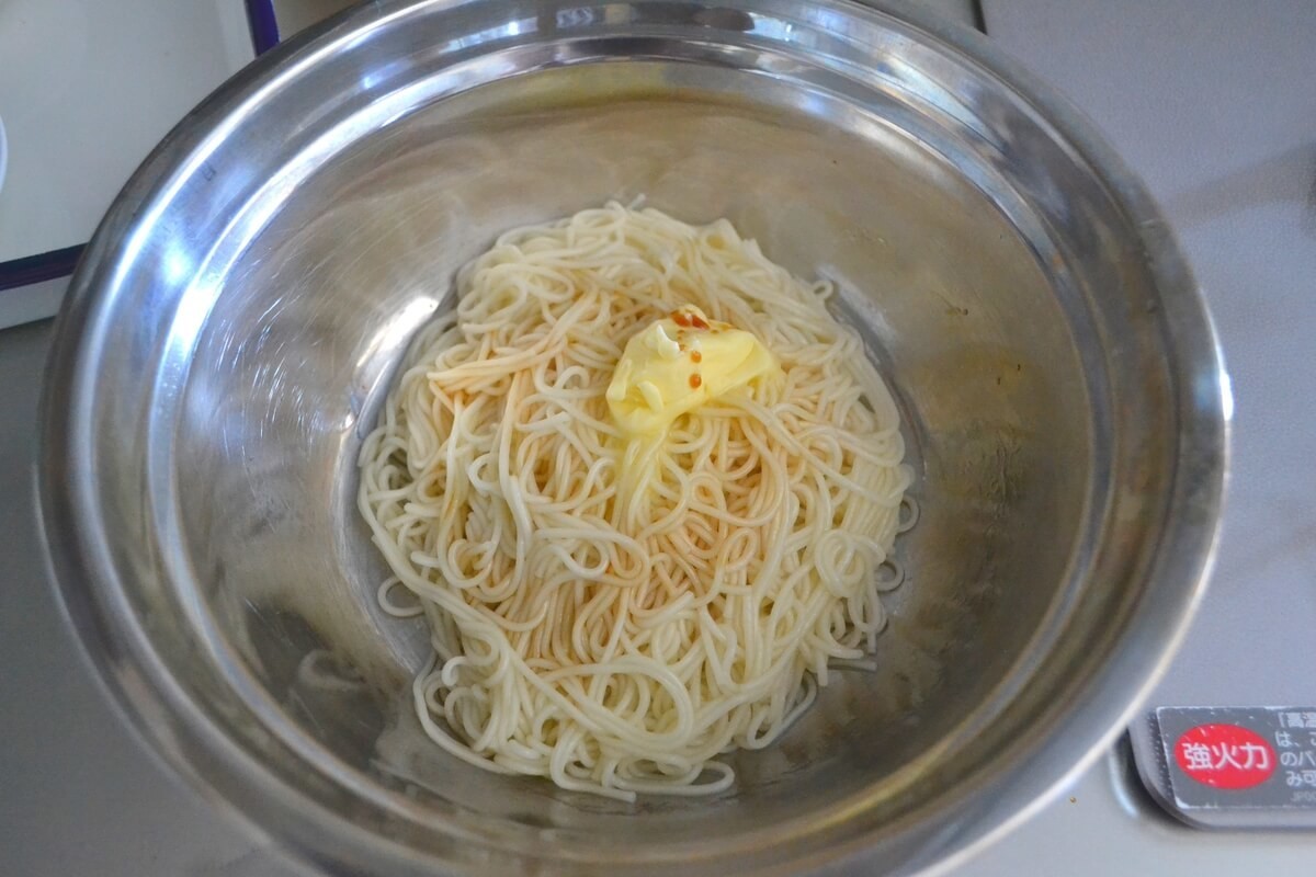 (3)(2)のそうめんが温かいうちにバターとめんつゆを入れ混ぜ、その後に明太子を入れよく和える